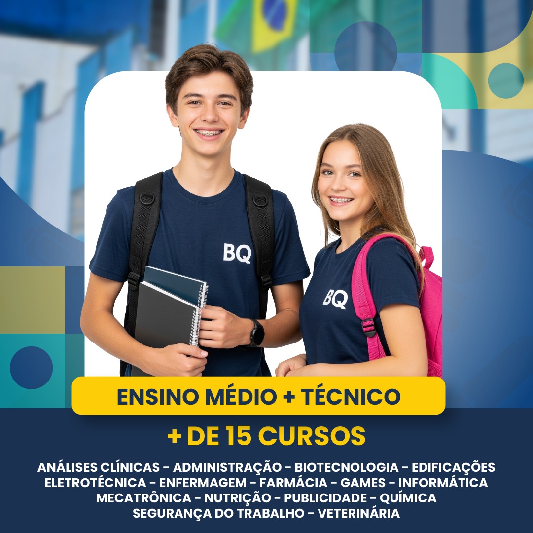 No BENTO QUIRINO, para quem concluiu o Ensino Fundamental, o Colégio oferece o Ensino Médio concomitante (junto) ao Curso Técnico (Habilitação Profissional Técnica de Nível Médio). Assim, ao final de três anos, os nossos alunos recebem: a certificação de conclusão do Ensino Médio, que possibilita a continuação/prosseguimento de estudos no nível universitário e o Diploma de Técnico na habilitação escolhida, que possibilita o acesso ao mercado de trabalho.